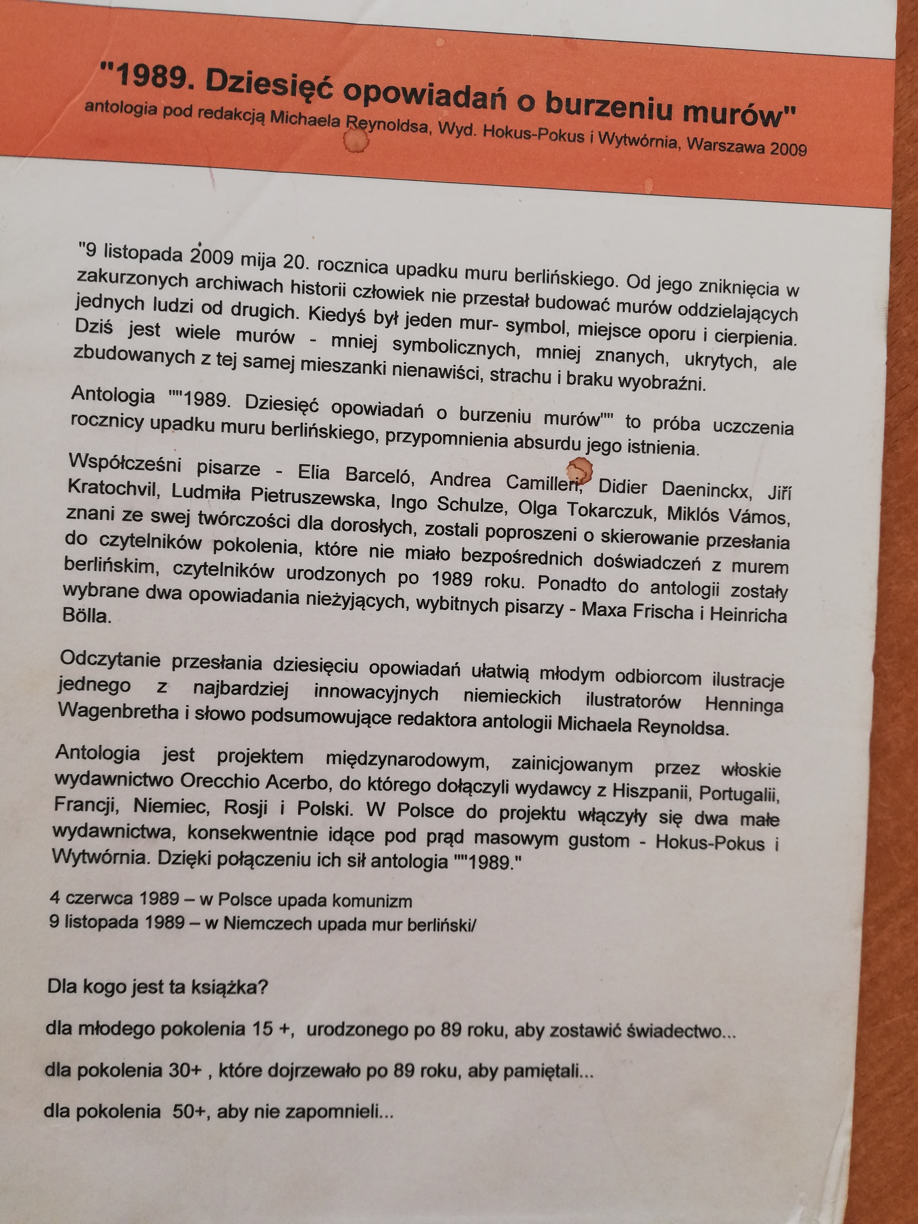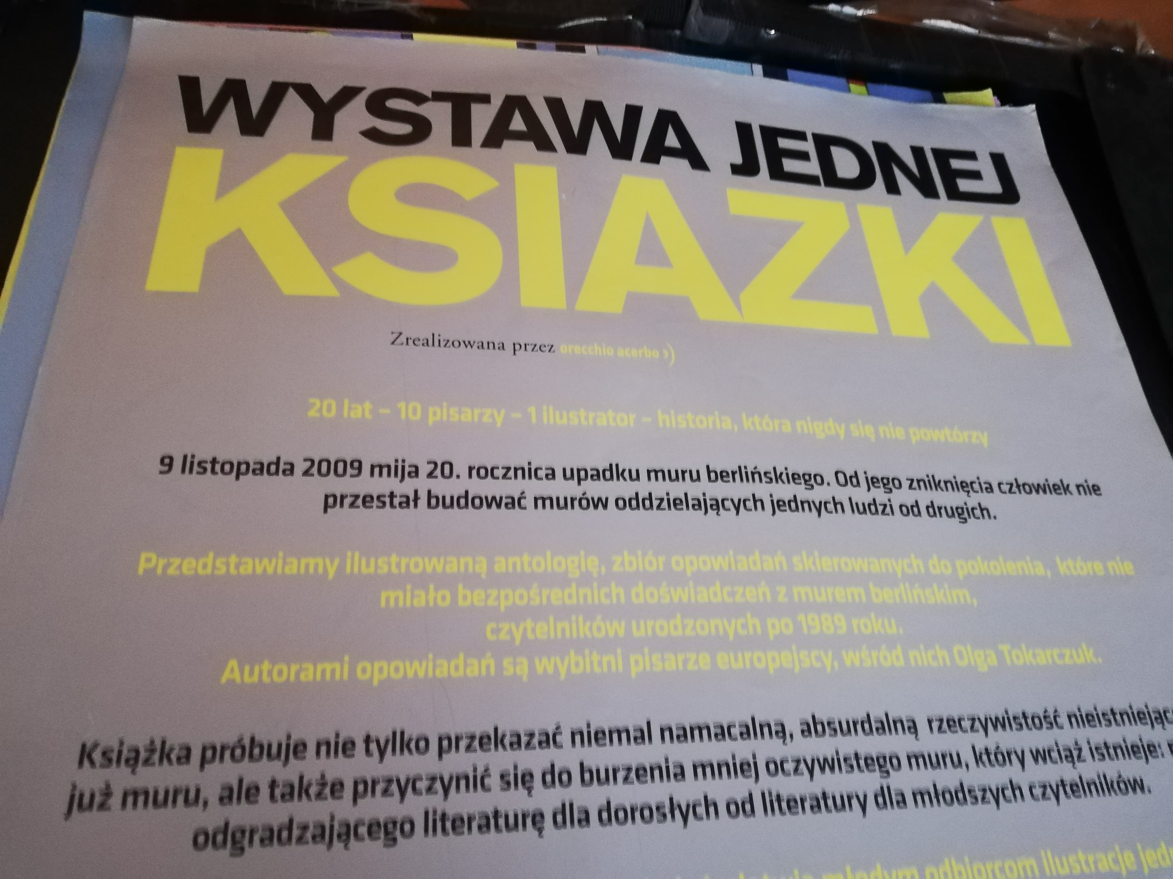 Wystawa prezentuje 30 ilustracji książkowych Henninga Wagenbretha, jednego z najważniejszych i najbardziej innowacyjnych niemieckich grafików i rysowników komiksów. Na plakatach można zobaczyć ilustracje do książki pod tym samym tytułem, która powstała w 2009 r. jako międzynarodowy projekt i na którą złożyło się osiem opowiadań współczesnych pisarzy z Czech, Francji , Hiszpanii, Niemiec, Polski, Rosji, Węgier i Włoch oraz dwa opowiadania nieżyjących już, wybitnych pisarzy (Heinricha Bölla oraz Maxa Frischa) adresowanych do młodych czytelników urodzonych po upadku muru. Dziesięć opowiadań zilustrowanych przez Henninga Wagenbretha to głos sprzeciwu wobec nietolerancji i smutnej szarości murów. W Polsce książka ukazała się nakładem dwóch wydawnictw Hokus Pokus i Wytwórnia.