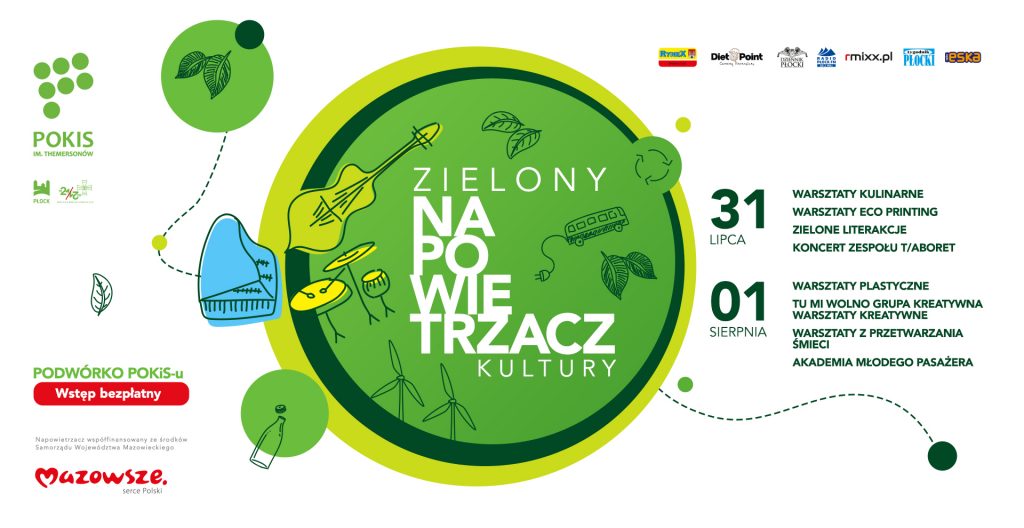 W ostatni weekend lipca (31 lipca – 1 sierpnia) zapraszamy na kolejną edycję plenerowych spotkań z kulturą. Tym razem podwórko POKiS zamieni się w ZIELONĄ strefę kulturalnej, ekologicznej zabawy. Do współpracy zaprosiliśmy płockie instytucje kultury oraz naszych partnerów, aby wspólnie pokazać Wam jak ekologicznie spędzać czas i przy okazji dobrze się bawić. Co w programie?