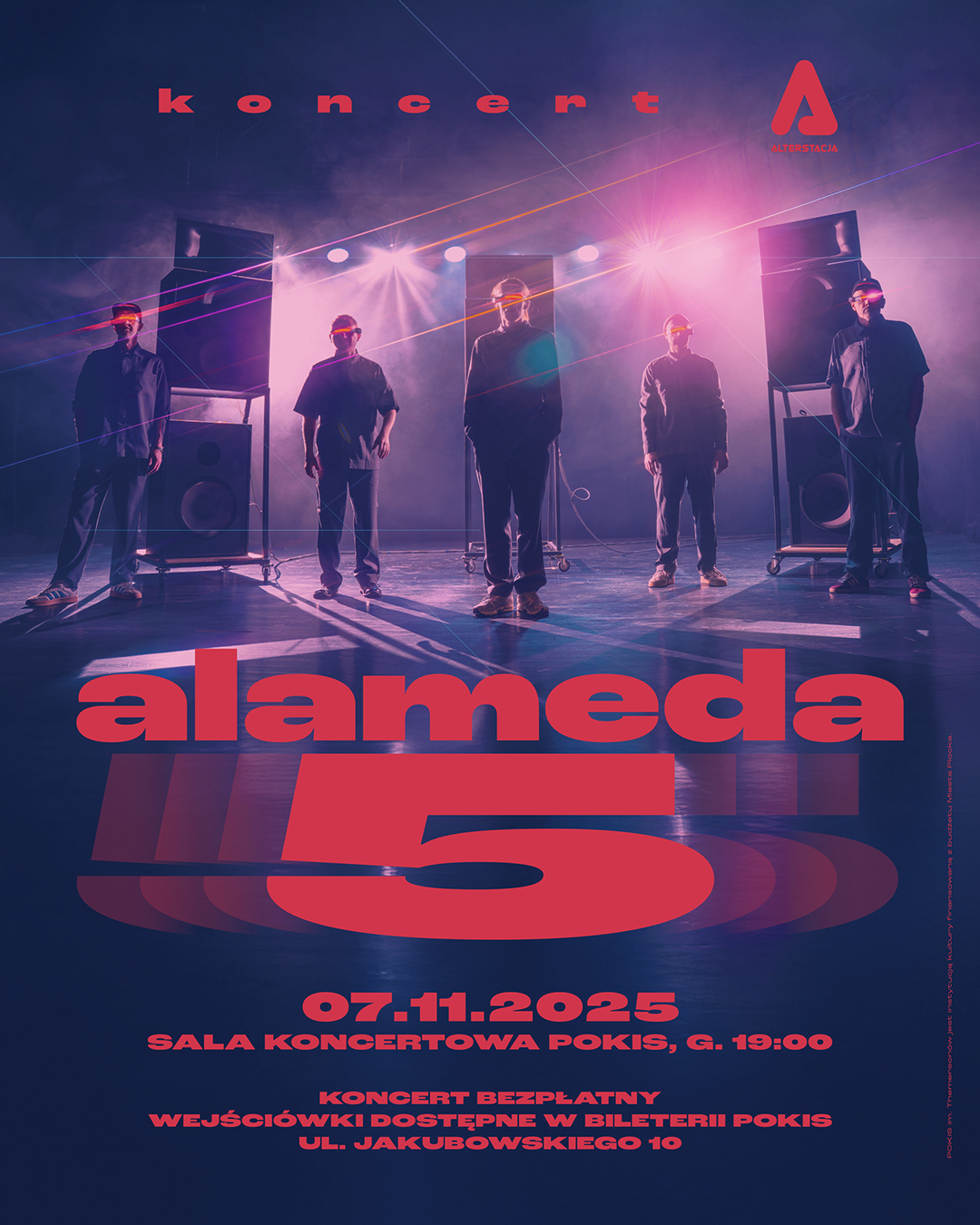 Zapraszamy na koncert zespołu ALAMEDA 5, jednego z najbardziej oryginalnych i nowatorskich projektów na polskiej scenie alternatywnej. Wydarzenie odbędzie się w piątek, 7 listopada 2025 roku o godzinie 19:00 w sali koncertowej POKiS przy ul. Jakubowskiego 10. Wstęp bezpłatny – wejściówki dostępne w bileterii POKiS, ul. Jakubowskiego 10.